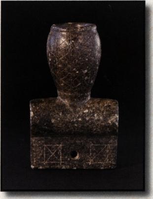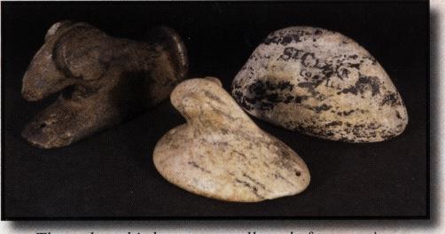 These three stones are made from gneiss. From left to right: This birdstone made from gneiss was probably once in contact with red ocher or ground hematite. Although the provenience has been lost, this birdstone was most likely found in Ohio. Bust birdstone found in Clinton County, Ohio, Featureless bust birdstone found in St. Clair County, Illinois.