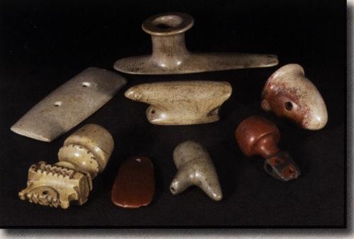 Five pipes, one gorget, one pendant and one birdstone made from various colors of pipestone from various sources. The animal form birdstone resembling a bear is made from tan-yellow pipestone and is from Crawford County, Ohio.