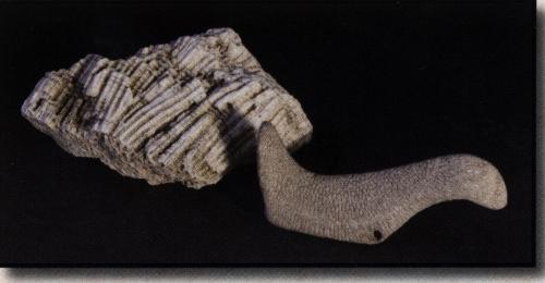 Typical birdstone made from highly weathered fossil coral. This birdstone was found in Rock County, Wisconsin. Illustrated behind the birdstone is a small sample of fossil coral found in Indiana.