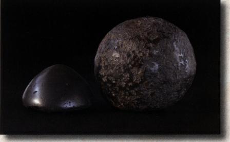 On the left is a highly polished hematite cone showing the polished silver/black coloration of hematite. On the right is a large prehistorically worked round ball of hematite showing the brown-red coloration of hematite.